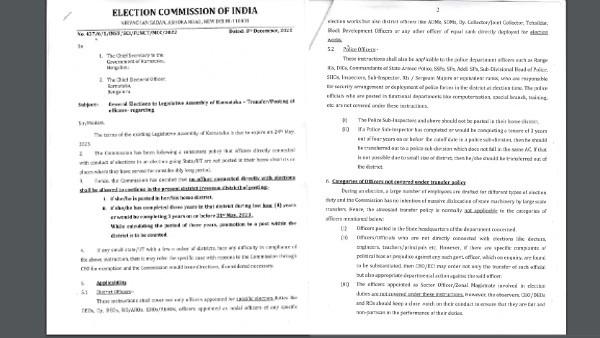ಬೆಂಗಳೂರು, ಡಿ. 13: ರಾಜ್ಯದಲ್ಲಿ ವಿಧಾನಸಭೆ ಚುನಾವಣೆ ಮುನ್ಸೂಚನೆಯನ್ನು ಕೇಂದ್ರ ಚುನಾವಣಾ ಆಯೋಗವೇ ನೀಡಿದೆ. ಗುಜರಾತ್ ಚುನಾವಣೆ ಮುಗಿದ ಬೆನ್ನಲ್ಲೇ ರಾಜ್ಯದಲ್ಲಿ 2023 ರ ವಿಧಾನಸಭೆ ಚುನಾವಣಾ ಕಣ ರಂಗೇರುತ್ತಿದೆ. ಇದರ ಬೆನ್ನಲ್ಲೇ ಅಧಿಕಾರಿಗಳ ವರ್ಗಾವಣೆಗೆ ಸಂಬಂಧಿಸಿದಂತೆ ಕೇಂದ್ರ ಚುನಾವಣಾ ಅಯೋಗ ಮಹತ್ವದ ಸುತ್ತೋಲೆ ಹೊರಡಿಸಿದೆ.